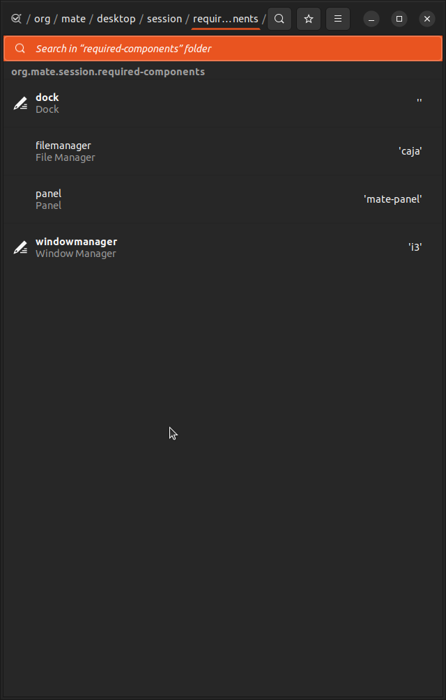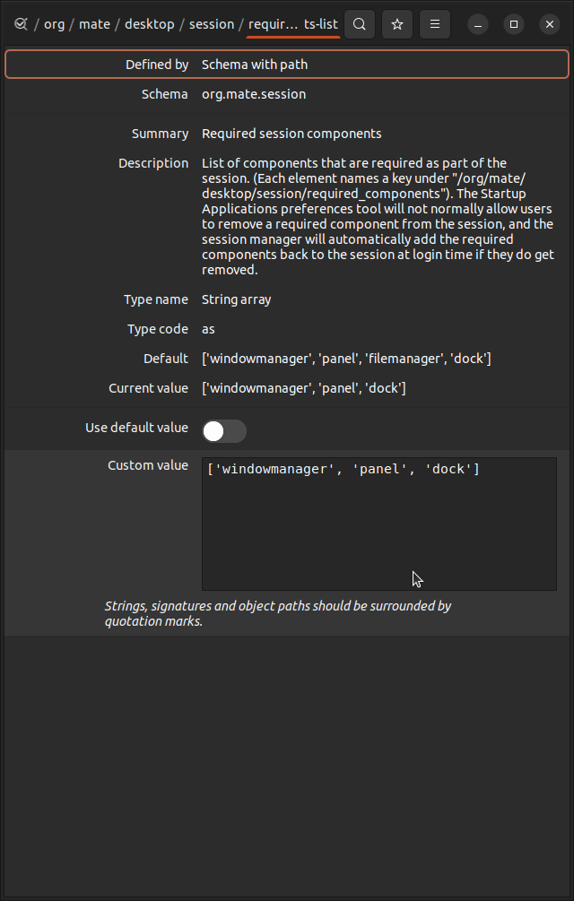 Then head up one level to org > mate > desktop > session and in required-component-list, delete filemanager. Without this MATE will open a background window for your desktop that will cover everything.